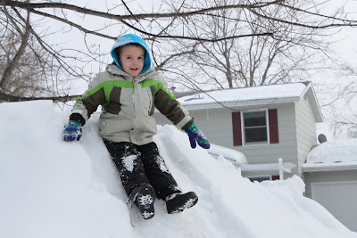 Austin didn't want to play, so he opted for the run around the circle the amount of times that you are old! Am I crazy? Maybe. But we are all going crazy here with this snow! By the way, this is all the snow in our circle. Yep, we have a mound about 15 feet tall. Apparently, it makes and excellent slide!